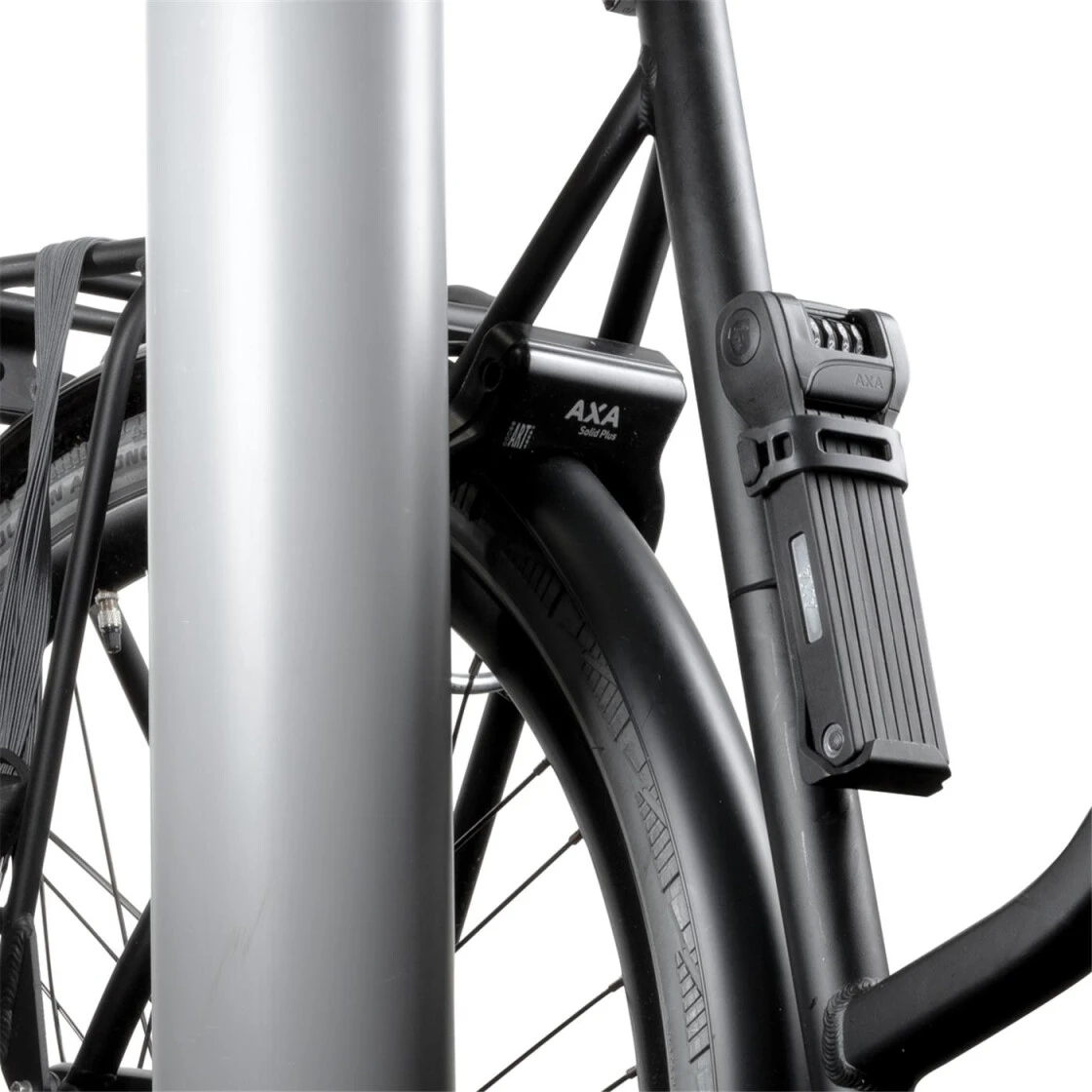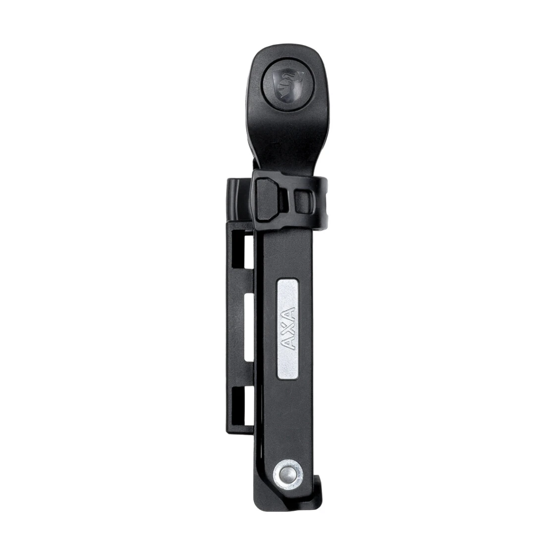 Das AXA Fold Lite wird mit einer praktischen Halterung geliefert. Mit dieser lässt es sich an Stelle eines Flaschenhalters montieren oder Sie befestigen es mit den 2 mitgelieferten Montagebändern am Rahmen. Da Sie das Schloss nicht aus dem Halter schieben müssen, ist es für alle Rahmen geeignet. Dank des revolutionären Schließmechanismus sitzt das Schloss fest in der Halterung und klappert während der Fahrt nicht.