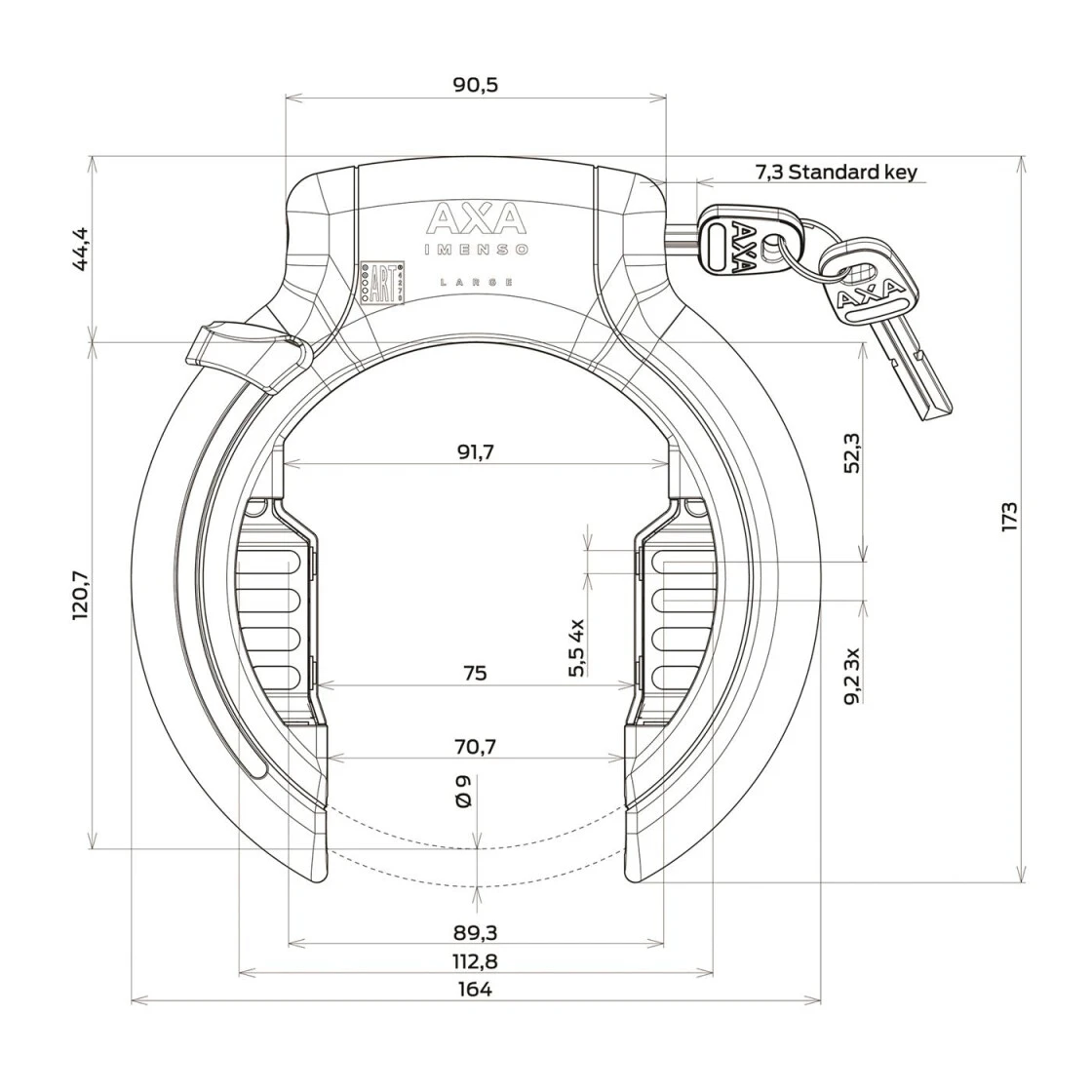 Gehärteter Stahlbügel und Schlossgehäuse ; Anti-Bohr-Platte im Zylinder; Montage mittels flexibler Befestigung, auch für abweichende Rahmenrohre; Extra breite Öffnung von 75 mm; Passt auf breite Schutzbleche oder Ballonreifen
