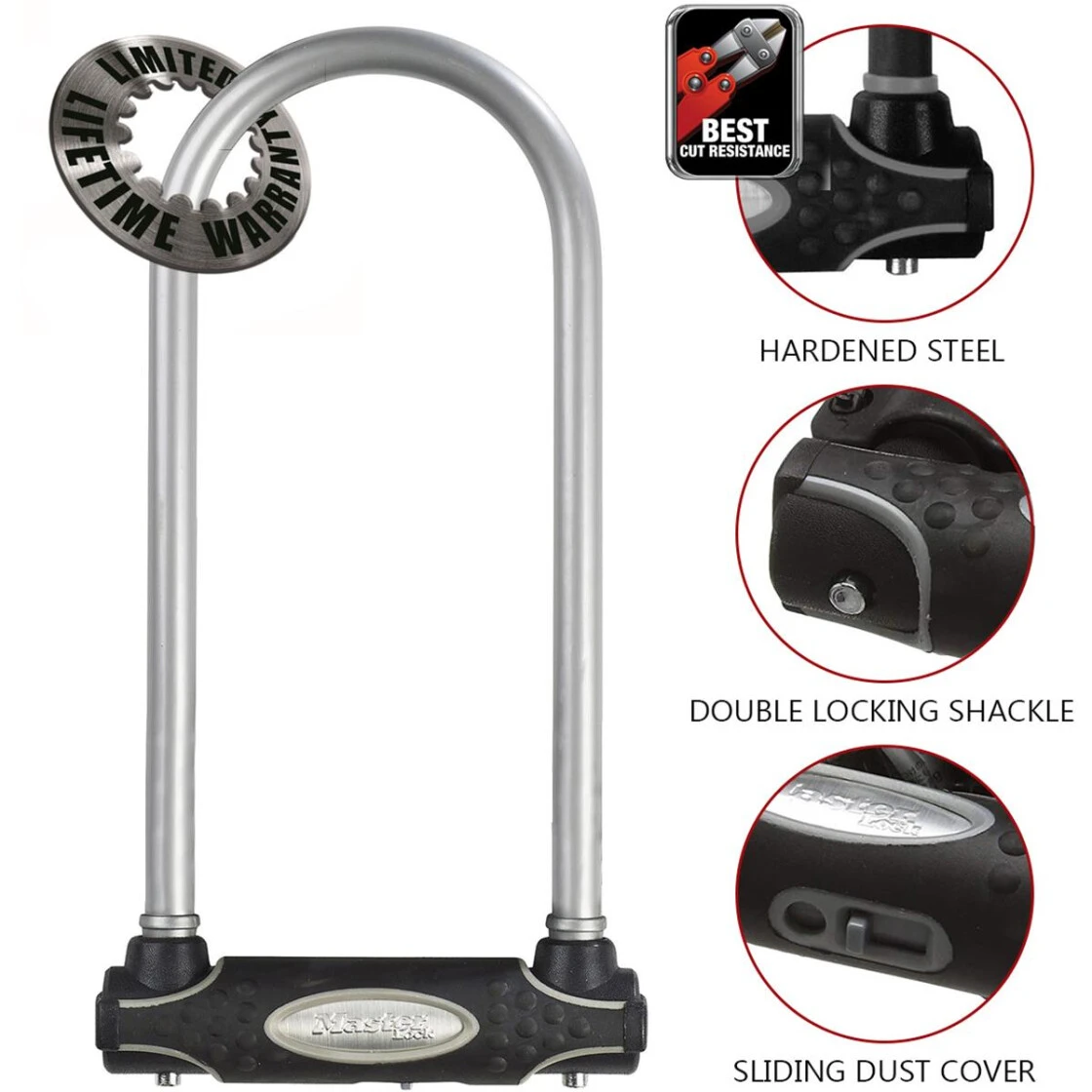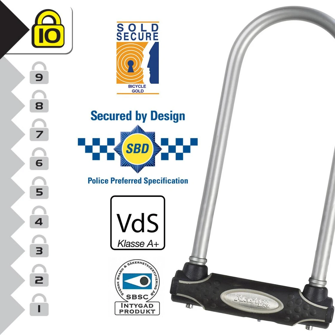 Dieses VDS-klassifizierte (A+) Bügelschloss im exklusiven Masterlock Design bietet eine der besten Möglichkeiten um Ihr Bike zu sichern. Optionale Reflexstreifen verbessern die Sichtbarkeit im Dunkeln. Auch als Kit mit Schlaufenkabel erhältlich.