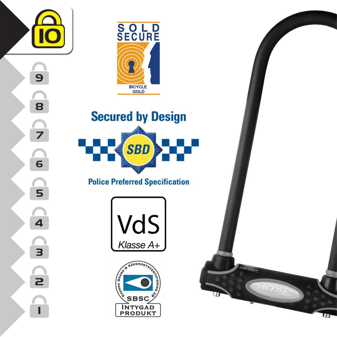 Dieses VDS-klassifizierte (A+) Bügelschloss im exklusiven Masterlock Design bietet eine der besten Möglichkeiten um Ihr Bike zu sichern. Optionale Reflexstreifen verbessern die Sichtbarkeit im Dunkeln. Auch als Kit mit Schlaufenkabel erhältlich.