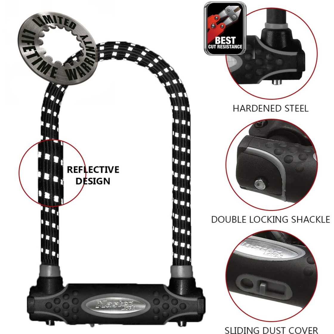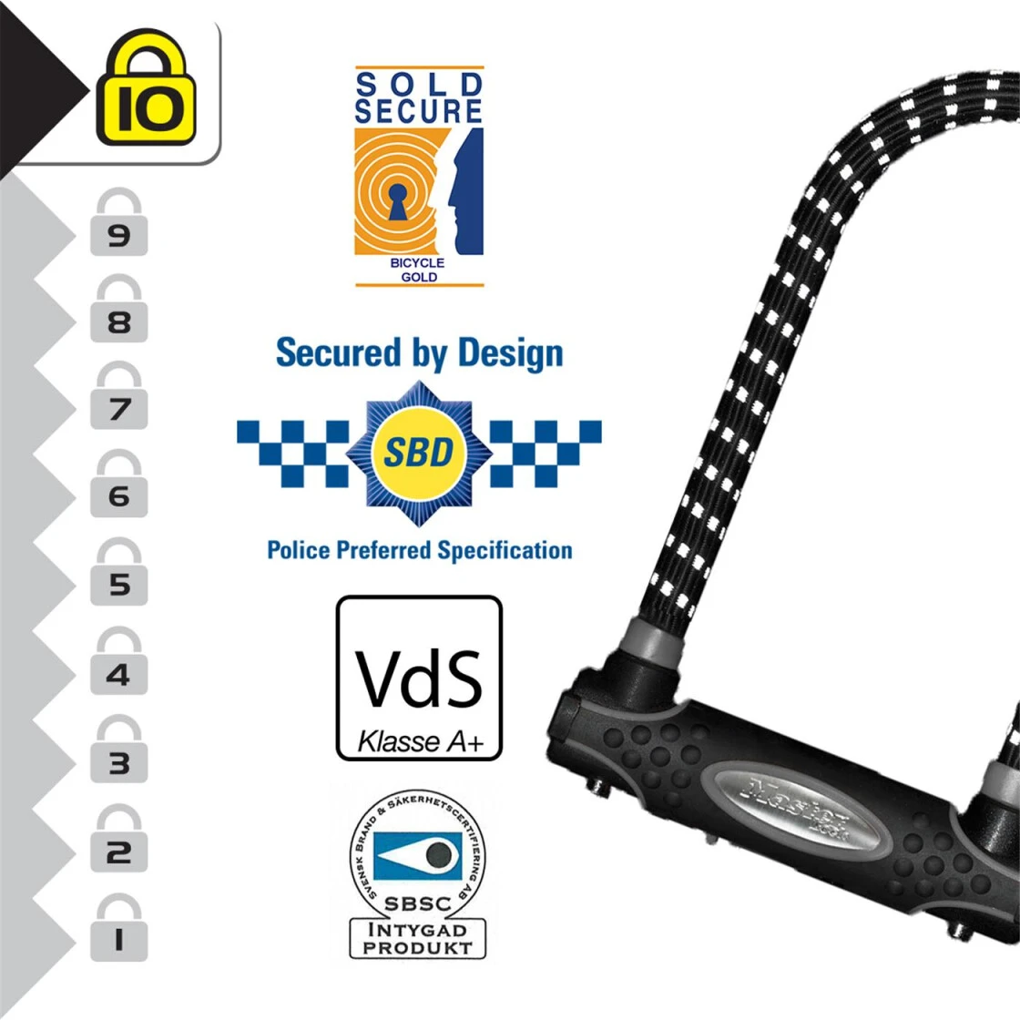 Dieses VDS-klassifizierte (A+) Bügelschloss im exklusiven Masterlock Design bietet eine der besten Möglichkeiten um Ihr Bike zu sichern. Optionale Reflexstreifen verbessern die Sichtbarkeit im Dunkeln. Auch als Kit mit Schlaufenkabel erhältlich.